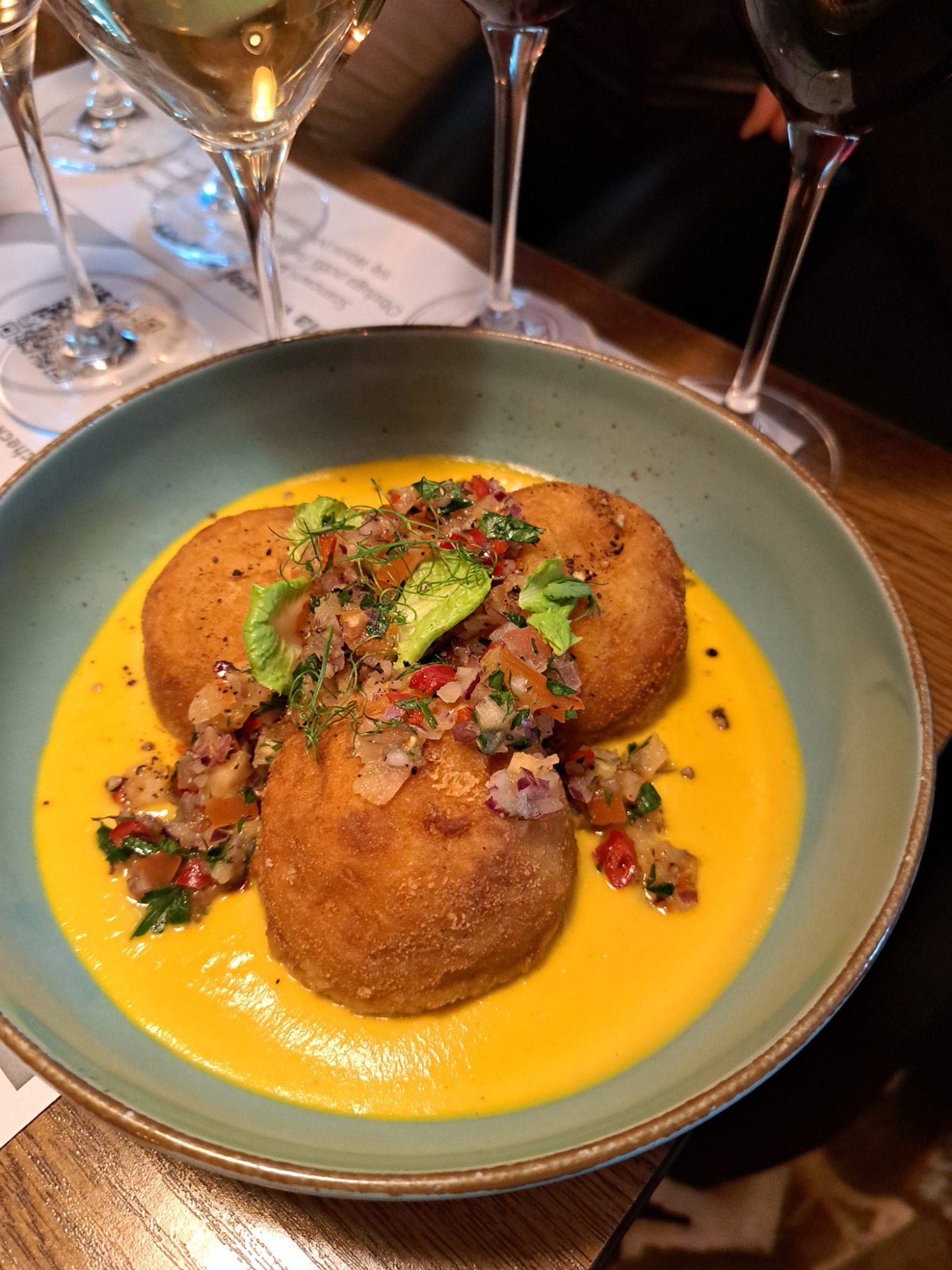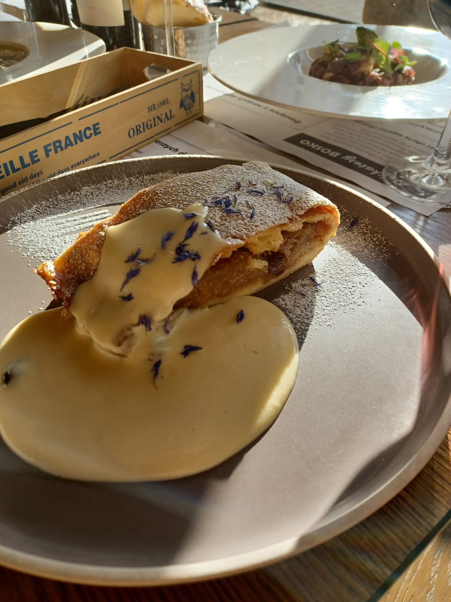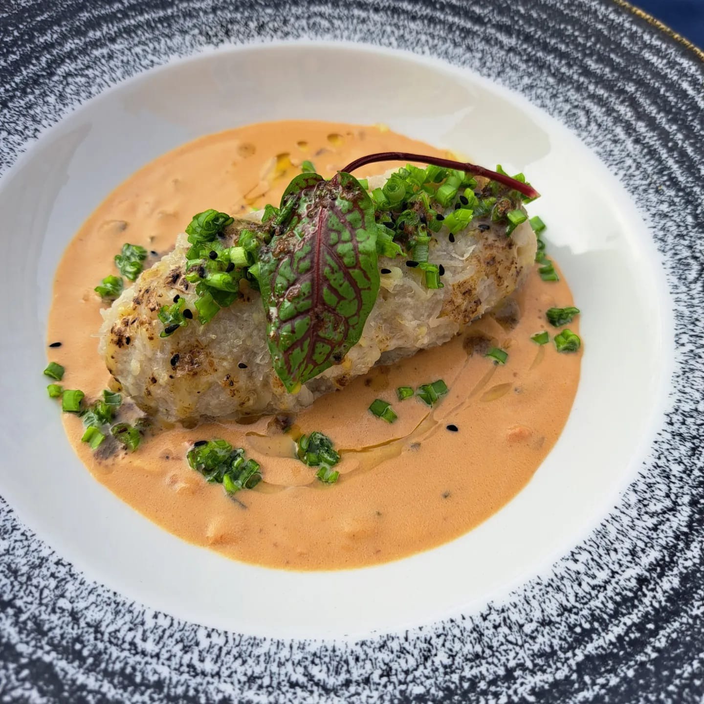 Ciasto pierogowe, polędwiczka z kurczaka panierowana, cebula karmelizowana, kapary, ser kozi, sos bbq -