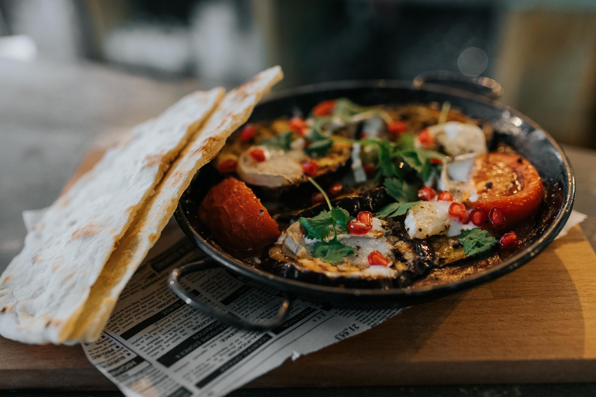Ciasto pierogowe, cebula, pomidor, bakłażan, ser solankowy, sos bbq
